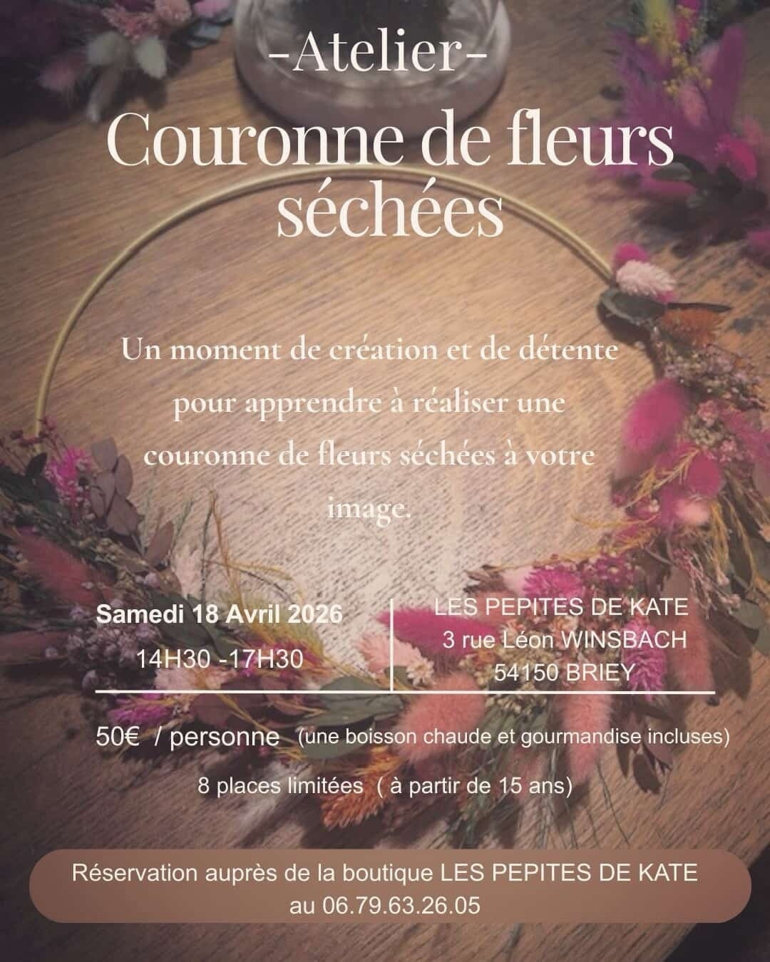 Atelier accessible à partir de 15 ans Tout le matériel est fourni Une boisson chaude & une gourmandise incluses 8 places limitées Tarif : 50€ / personne Réservation 06.79.63.26.05 ( un acompte sera demandé à la réservation)