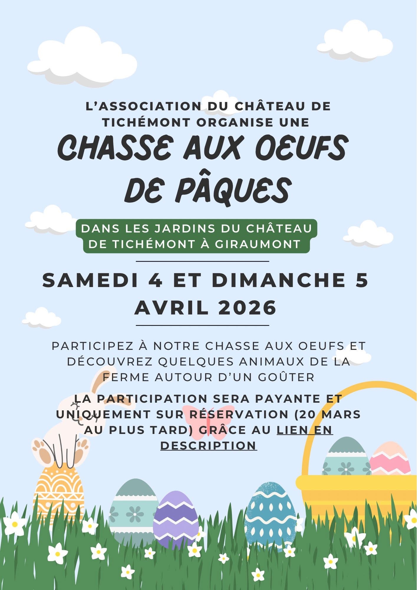 L’association du Château de Tichémont vous propose organise une chasse aux oeufs au coeur des jardins du château de Tichémont, entourés de quelques animaux de la ferme, et vous terminerez par un gouter. Plusieurs créneaux sont disponibles : - samedi 4 avril : de 9h30 à 11h30 ou de 14h30 à 16h30 - dimanche 5 avril : de 9h30 à 11h30 ou de 14h30 à 16h30 La participation sera uniquement sur réservation pour organiser au mieux la journée. Inscription : https://www.helloasso.com/.../boutiques/chasse-aux-oeufs