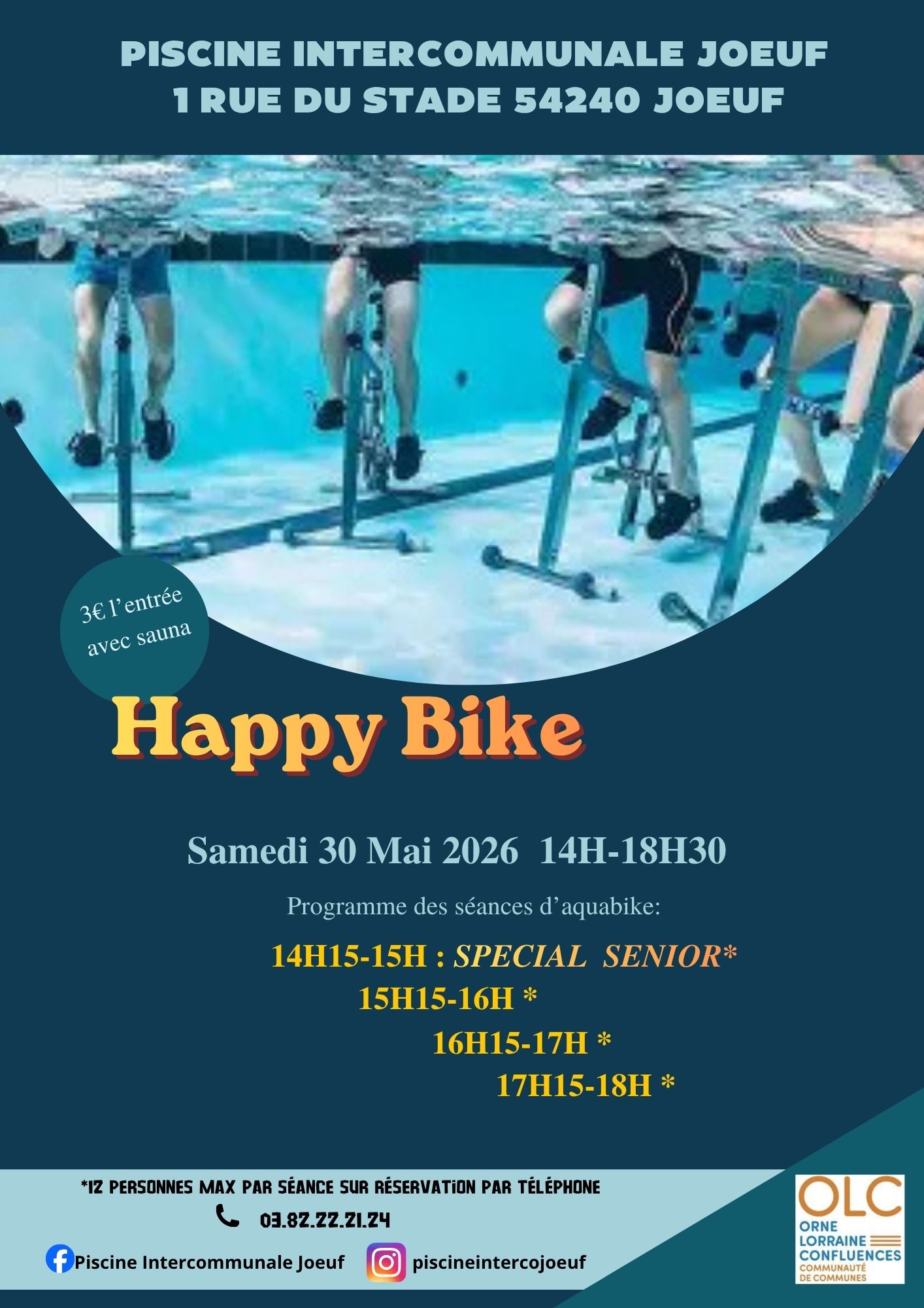 Au programme : 14h15 – 15h : séance spéciale seniors 15h15 – 16h : séance 16h15 – 17h : séance 17h15 – 18h : séance Réservation obligatoire au 03.82.22.21.24 12 personnes maximum par session Tarif : 3€ la séance (sauna inclus)
