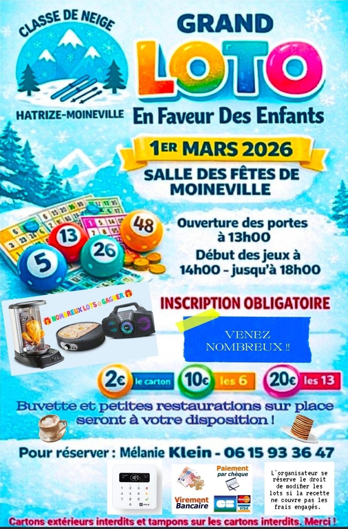 L’association Classe de Neige Hatrize-Moineville vous invite à un loto 100 % convivial, familial et ultra festif De nombreux lots à gagner Un beau geste solidaire pour aider les enfants à partir en classe de neige