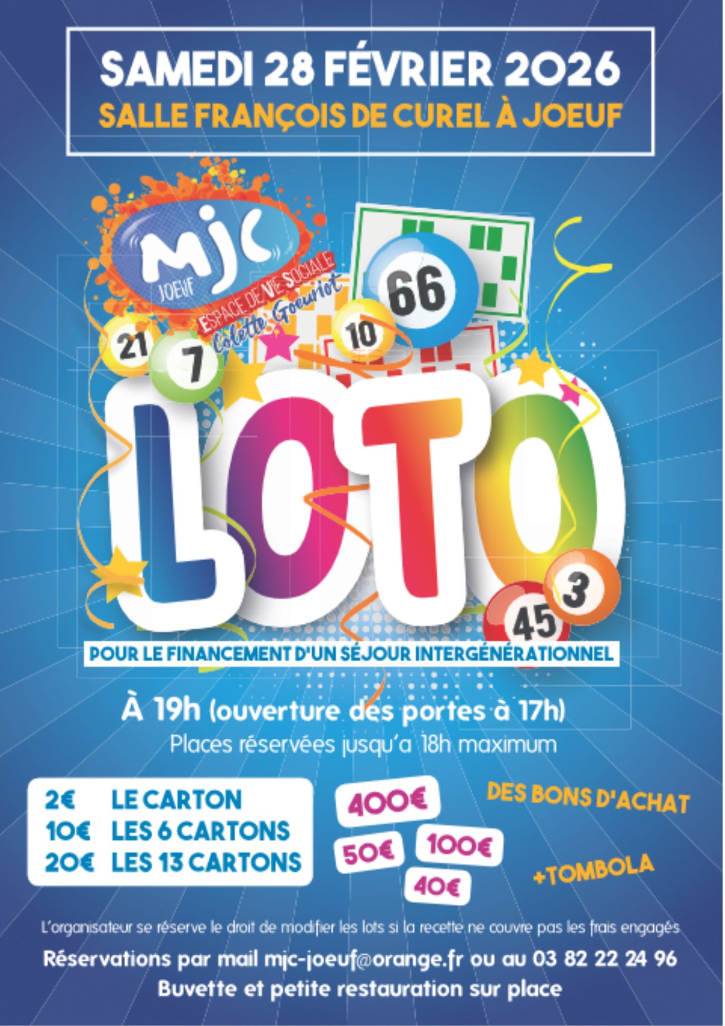 La Mjc Evs de Joeuf organise un loto avec de nombreux lots à gagner et tombola. Ouverture des portes à 17h, places réservées jusque 18h