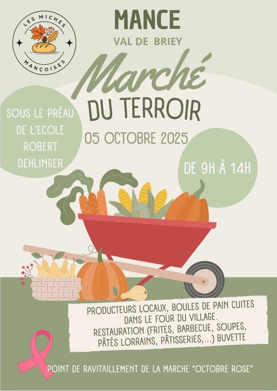 L'association Les Miches Mançoises organisent le marché du terroir dans la cour de l'école de Mance (lieu de ravitaillement de la Marche Rose). Vous pourrez y découvrir des producteurs locaux ainsi que les fameuses boules de pain cuites dans le four à bois du village. Restauration et buvette sur place