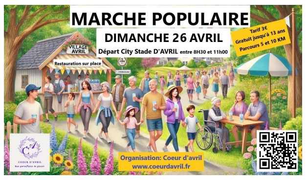 Marche populaire proposée par l'association Coeur d'Avril. Parcours 5 et 10km. Participation 3€ (gratuit jusqu'à 13 ans) Restauration sur place