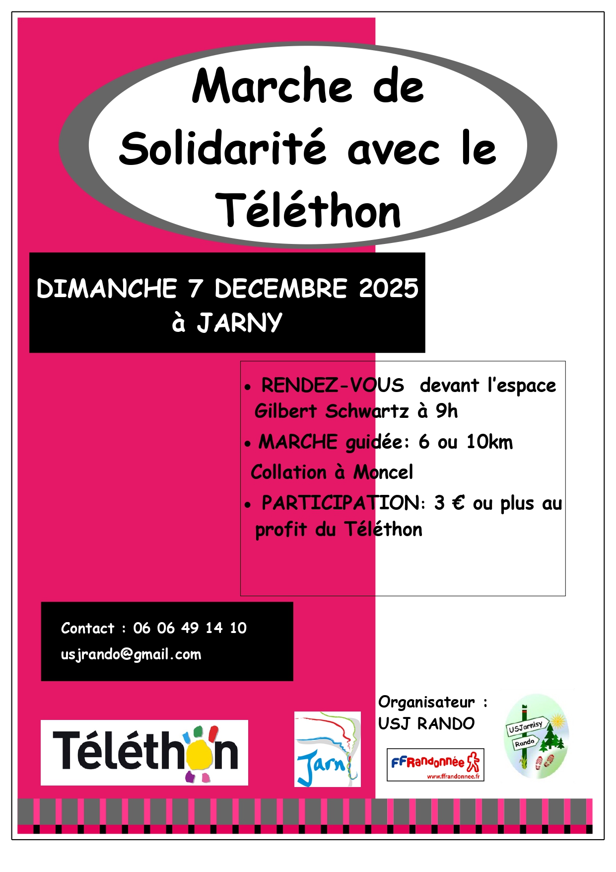 Organisée par l'USJ rando Marche 6km ou 10km Participation 3€ au profit du Téléthon