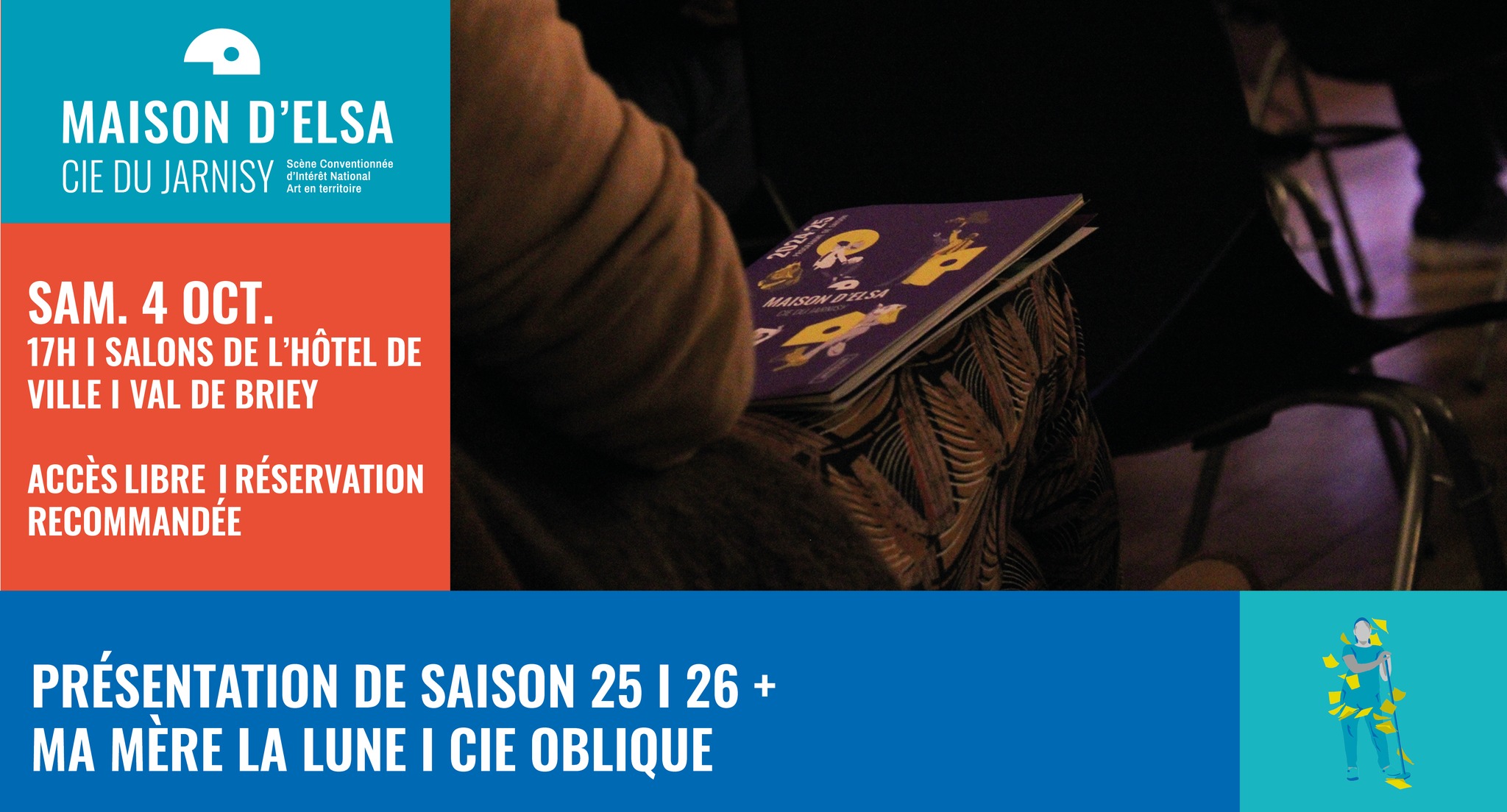 À Jarny et à Val de Briey, la présentation n’est pas exhaustive mais elle est dingo. Non, bingo. Venez jouer avec nous au bingo de la saison. Après trente minutes d’amusement, place au spectacle Ma mère la lune. Comme toujours la soirée se termine par un verre de l’amitié. INFOS PRATIQUES Samedi 4 octobre I 17h Salons de l'Hôtel de Ville I Val de Briey Evènement gratuit Réservation recommandée : com@jarnisy.com 03 82 33 28 67 ou billetterie en ligne : https://www.billetweb.fr/pro/maisonelsaciejarnisy MA MÈRE LA LUNE - Compagnie Oblique Au centre de l’arène, une femme, fantasque et drôlement habillée, accueille le public. À chacun·e, elle propose un verre à boire. Et bientôt, de la trentaine de cartons qui occupent l’espace, elle exhume des souvenirs, des objets, qui sont autant de prétextes à revivre sa jeunesse. À se remémorer son père autoritaire et, surtout, sa mère. Elle se souvient de son humilité et de sa joie continue, de son amour obsessionnel pour les mots, de sa collection de post-it. La femme est là pour célébrer cette mère, femme de ménage dans un lycée, qui n’en pouvait plus de lutter face à la modernité. Ce récit tendre et cinglant rend hommage aux personnes invisibilisées. Grâce à sa bande-son faite de tubes intergénérationnels, Ma mère la lune est plus qu’un spectacle : c’est une cérémonie joyeuse qui bouscule les préjugés.