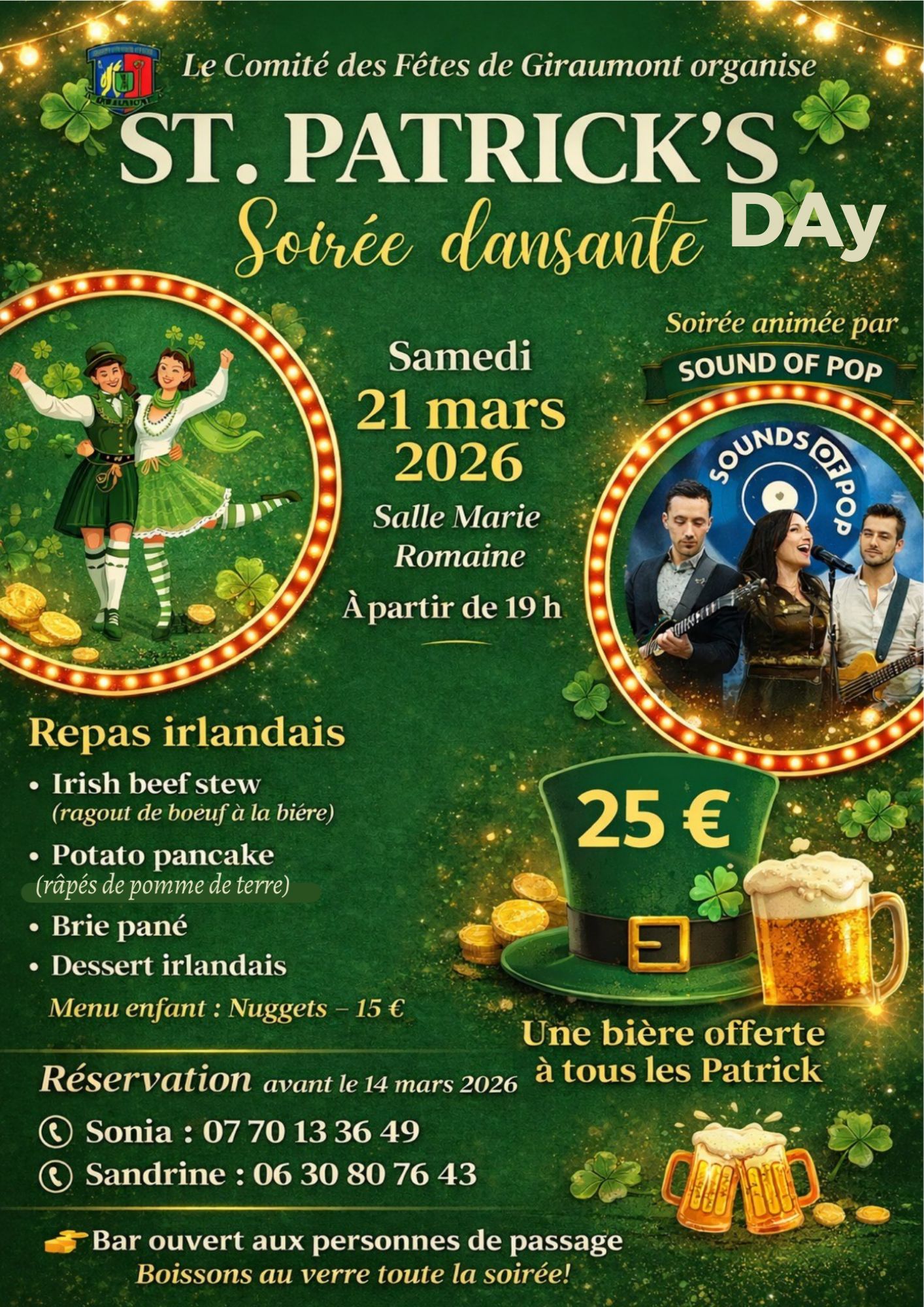 Soirée de la St Patrick proposée par le Comité des Fêtes de Giraumont Ambiance assurée par SOUNDS OF POP Repas irlandais Bar ouvert toute la soirée 25€ adultes | 15€ enfants Réservations : Sonia 07 79 13 36 49 / Sandrine 06 06 06 06 07