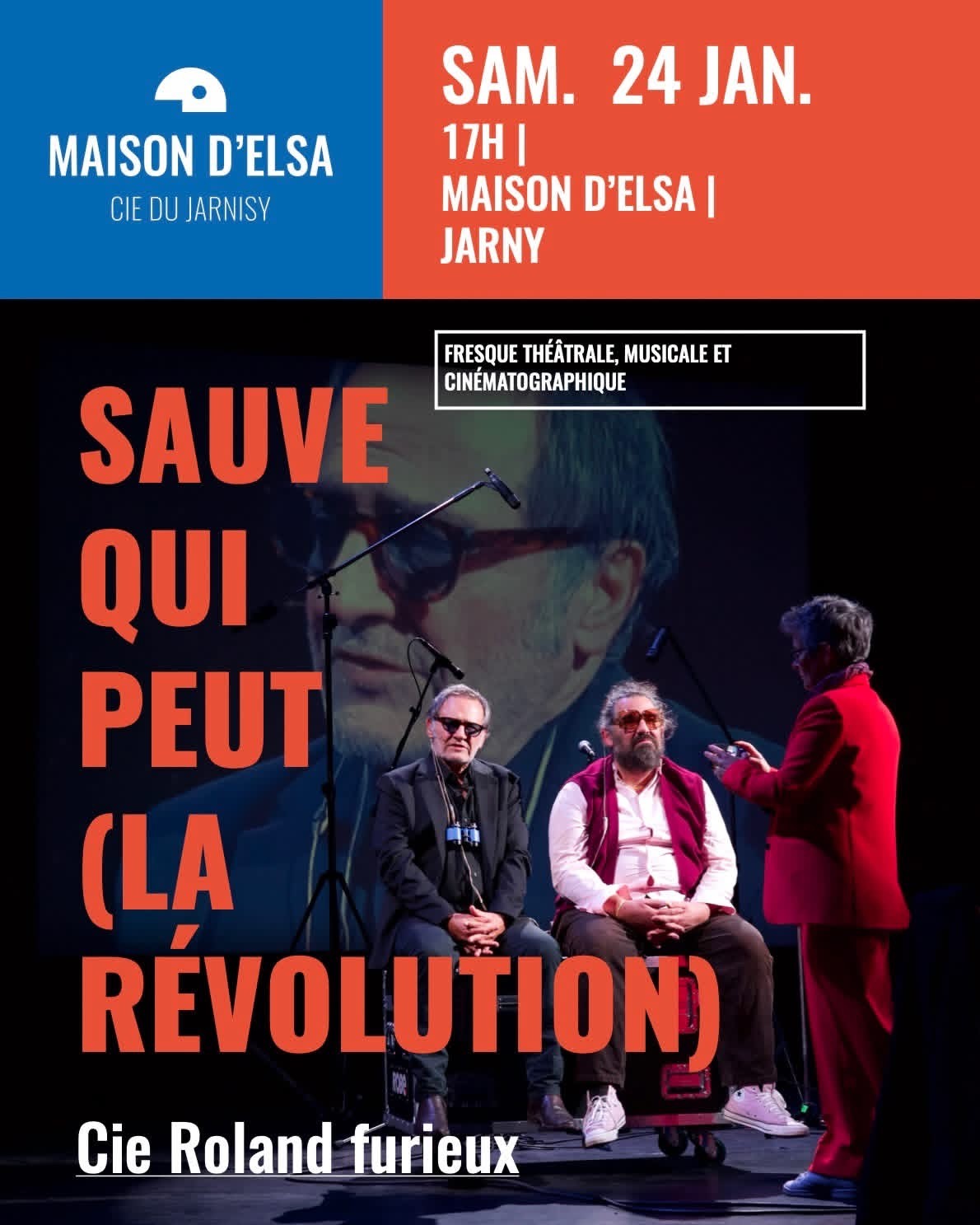 Le mot révolution peut-il encore nous (é)mouvoir ? Jean-Luc Godard a hésité et puis a fini par accepter la proposition de Jack Lang : imaginer un film pour fêter le bicentenaire de la Révolution. Tel un laboratoire effervescent, le spectacle donne à voir le cheminement du cinéaste pour réaliser son œuvre. On y croise donc Godard, mais aussi Danton, une inoubliable Marguerite Duras et d’autres figures liées au créateur. Au centre de cette expérience scénique, les notions de bouleversements et de rapport au monde sont traitées à la manière du collage : archives, manifestes, rushes détournés, éclats de musique, extraits d’émissions radiophoniques… Autant de sources hétérogènes qui façonnent ce cabaret politique vif et mordant.