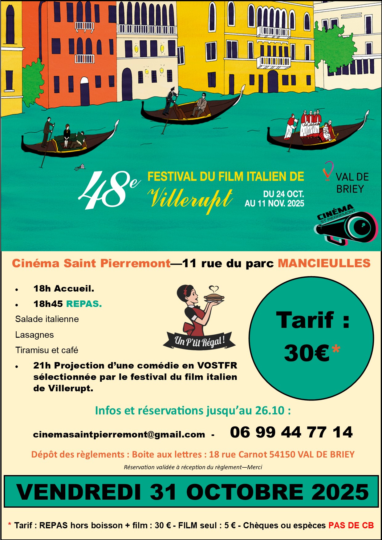 Fort du succès des précédentes soirées italiennes, le Cinéma Saint Pierremont - Mancieulles a le privilège d'être, cette année encore, un lieu de décentralisation du ???????????????????????????????? ???????? ???????????????? ???????????????????????????? ???????? ???????????????????????????????????? 18h - Accueil 18h45 - Repas italien : salade, lasagnes et tiramisu Un P'tit Régal 21h - Projection d'une comédie italienne en VOST dans le cadre du Festival du Film italien de Villerupt Réservations jusqu'au 26/10 (dans la limite des places disponibles 06 99 44 77 17 ou cinemasaintpierremont@gmail.com ????????????????????́???? ????????????????????????̀???????? 30€ (hors boisson) - ???????????????? ???????????????? 5€ Voir moins