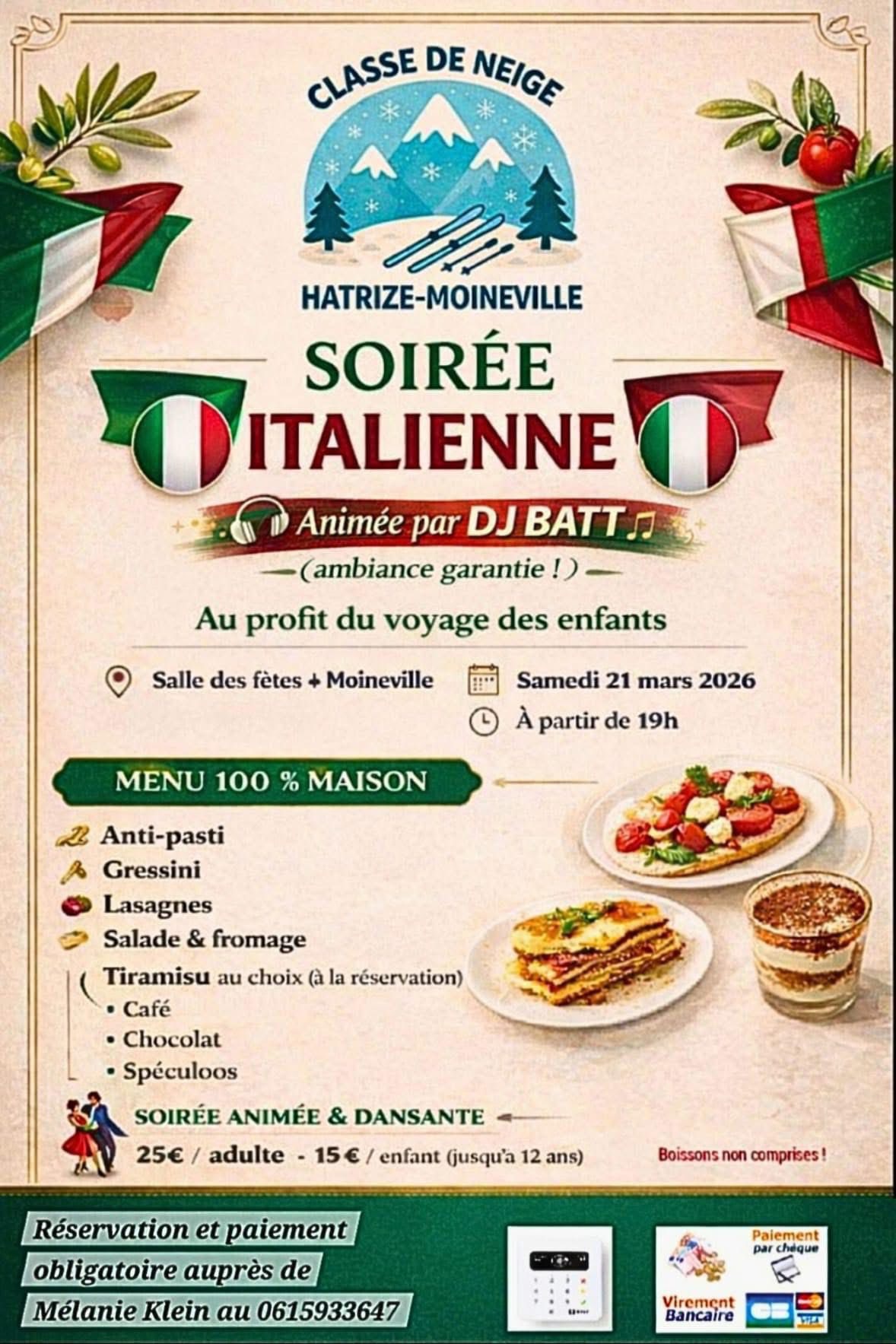 Soirée Italienne Solidaire au profit de l’Association Classe de Neige Hatrize‑Moineville Au menu : saveurs italiennes, bonne humeur et moments de partage Ambiance chaleureuse garantie
