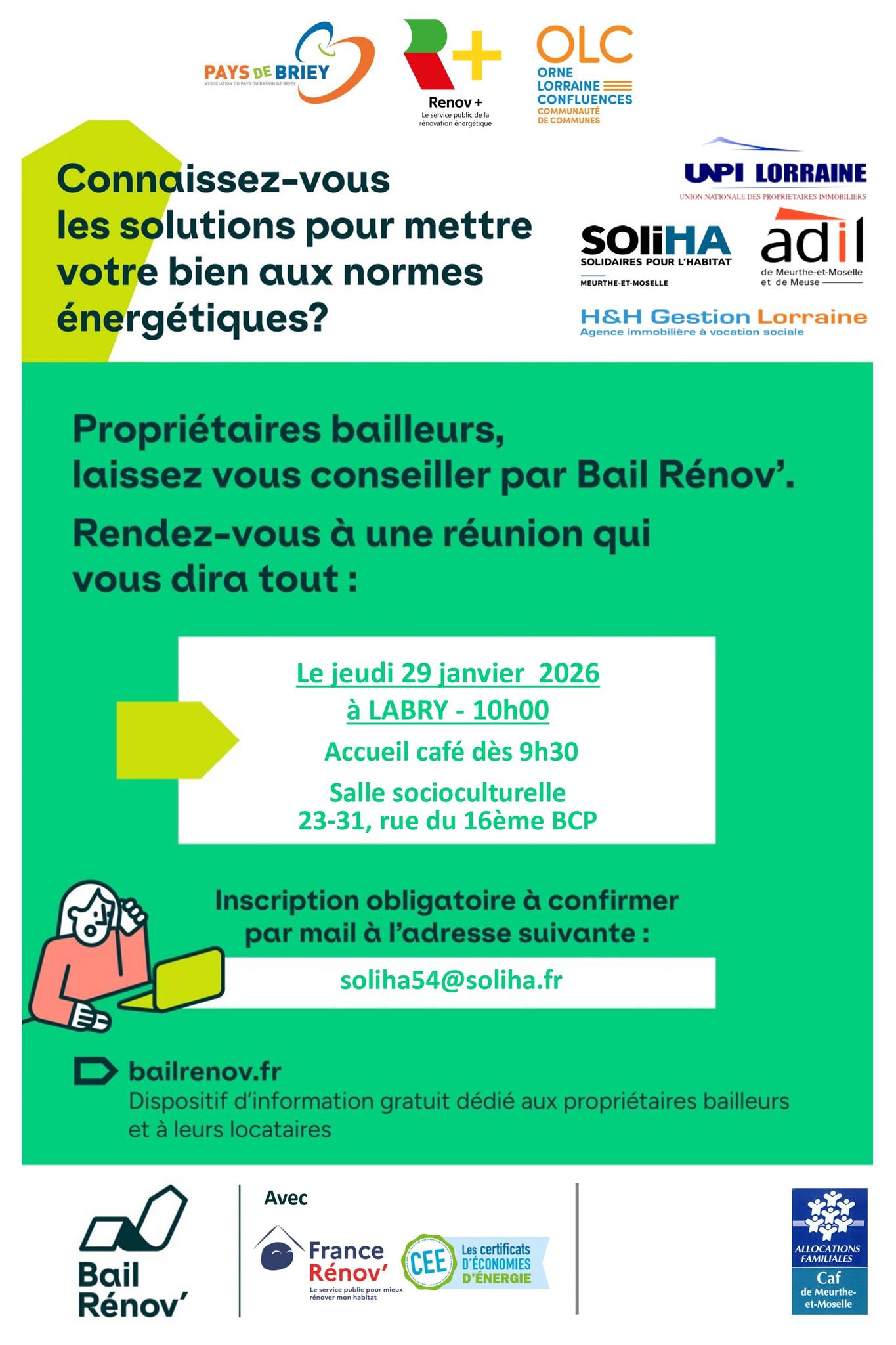 Vous êtes propriétaire bailleur et vous vous interrogez sur la mise aux normes énergétiques de votre logement ? Une réunion d’information est organisée pour vous accompagner et vous apporter des réponses concrètes. Dans le cadre du dispositif Bail Rénov’, une rencontre dédiée aux solutions de rénovation énergétique à destination des propriétaires bailleurs aura lieu jeudi 29 janvier 2026 à 10h, à la salle socioculturelle de Labry. Un accueil café sera proposé dès 9h30. Cette réunion permettra de mieux comprendre les obligations réglementaires, les solutions techniques existantes et les dispositifs d’accompagnement mobilisables pour améliorer la performance énergétique des logements. La participation est gratuite, sur inscription obligatoire par mail à l’adresse suivante : soliha54@soliha.fr.