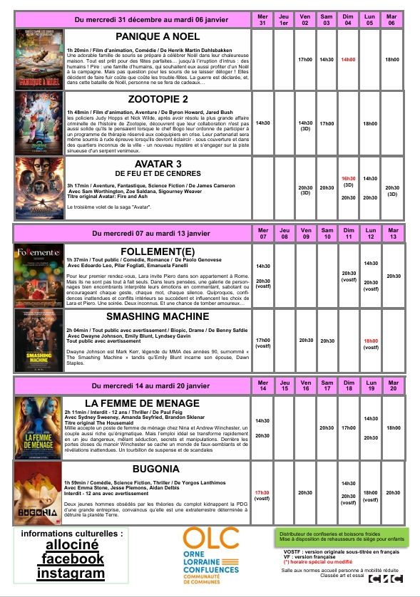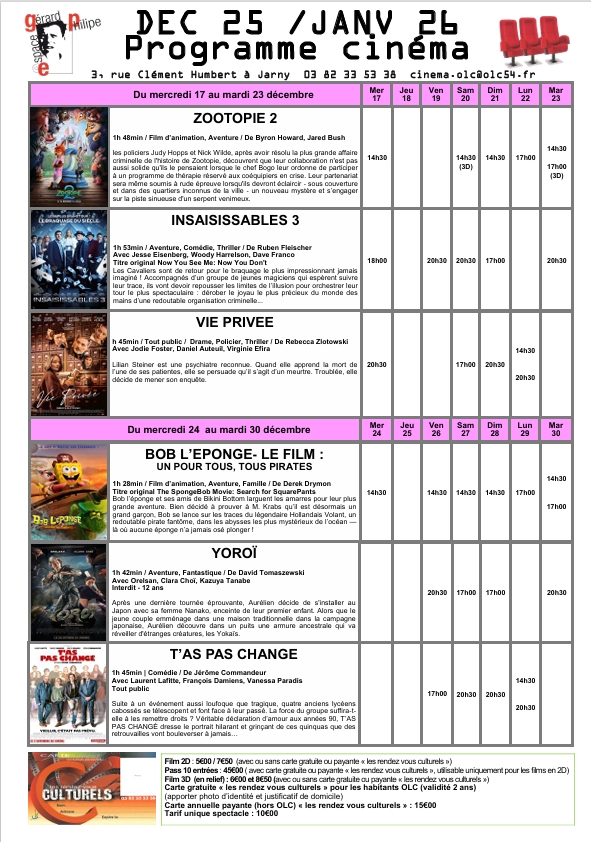 Programme ciné – Séances Visionnez les FILMS à côté de chez vous Cinéma Casino 8 Rue de Franchepré54240 JOEUF Voir les séances Cinéma Jean Vilar 1 Rue des Docteurs Grandjean 54800 CONFLANS-EN-JARNISY Voir les séances Cinéma St Pierremont 11 Rue du Parc MANCIEULLES54790 VAL DE BRIEY Voir les séances Espace Gérard Philipe 3 Rue Clément Humbert54800 JARNY Voir les séances