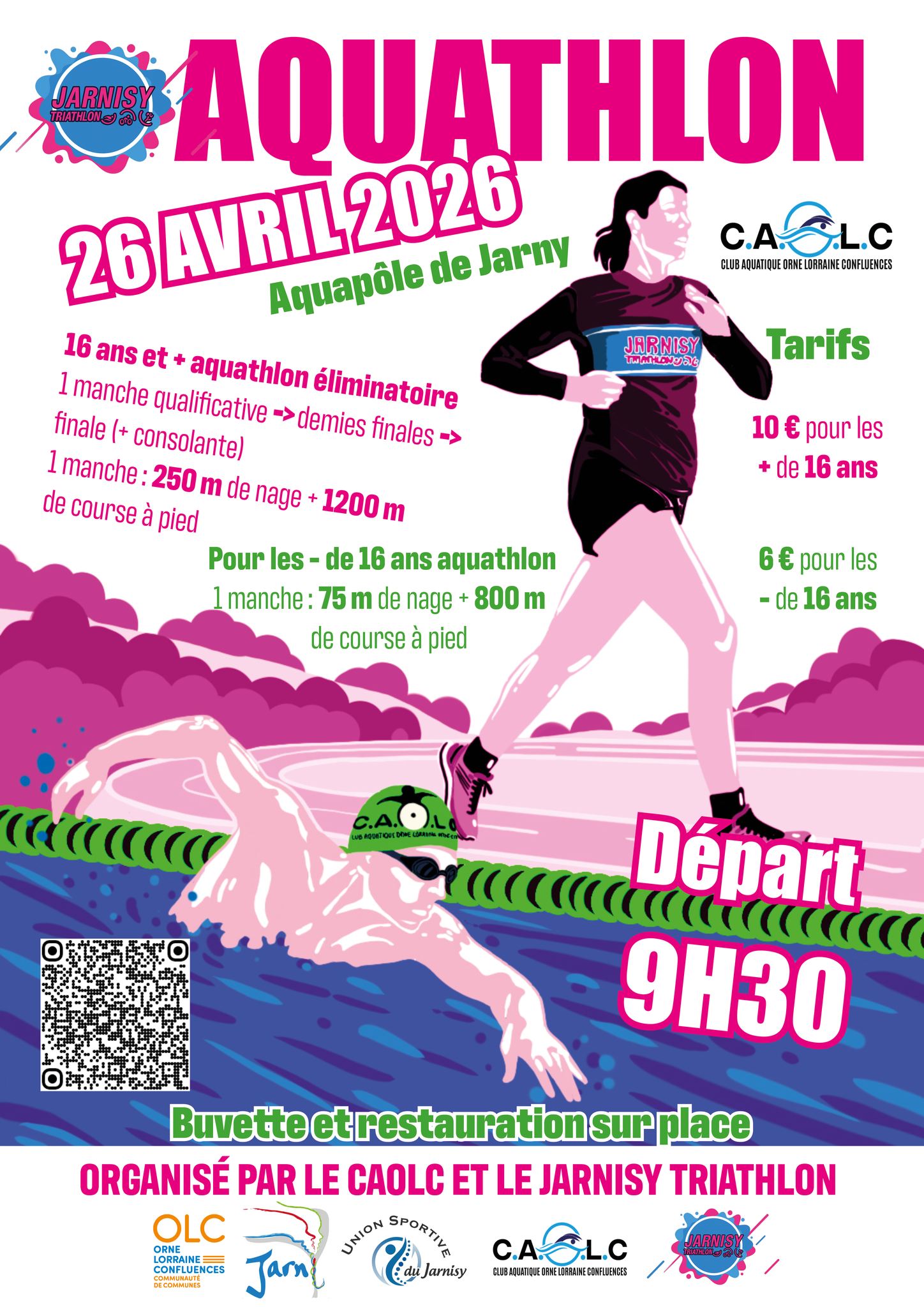 Natation + course à pied. Format éliminatoire (qualif → demies → finale)