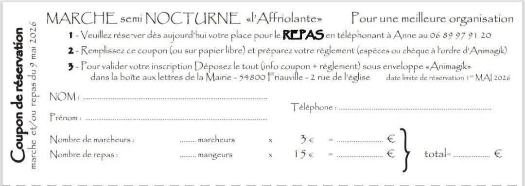 Organisé par l'association Animagik. 3 parcours 5km, 10km ou 15km Départs entre 17h et 19h Buvette et restauration sur place. Repas lorrain (sur réservation)